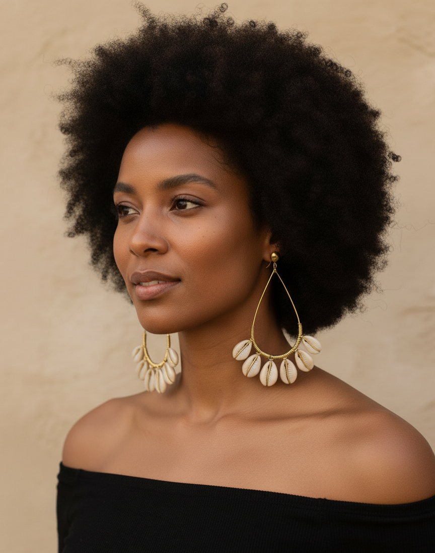 Redefine the classic hoop with the Amani Infinite Cowrie Hoops. These striking, elongated teardrop earrings feature a sophisticated silhouette that marries traditional African symbols with modern geometric design. Ethically sourced from the continent and curated in Barbados, they are a masterclass in diaspora elegance.