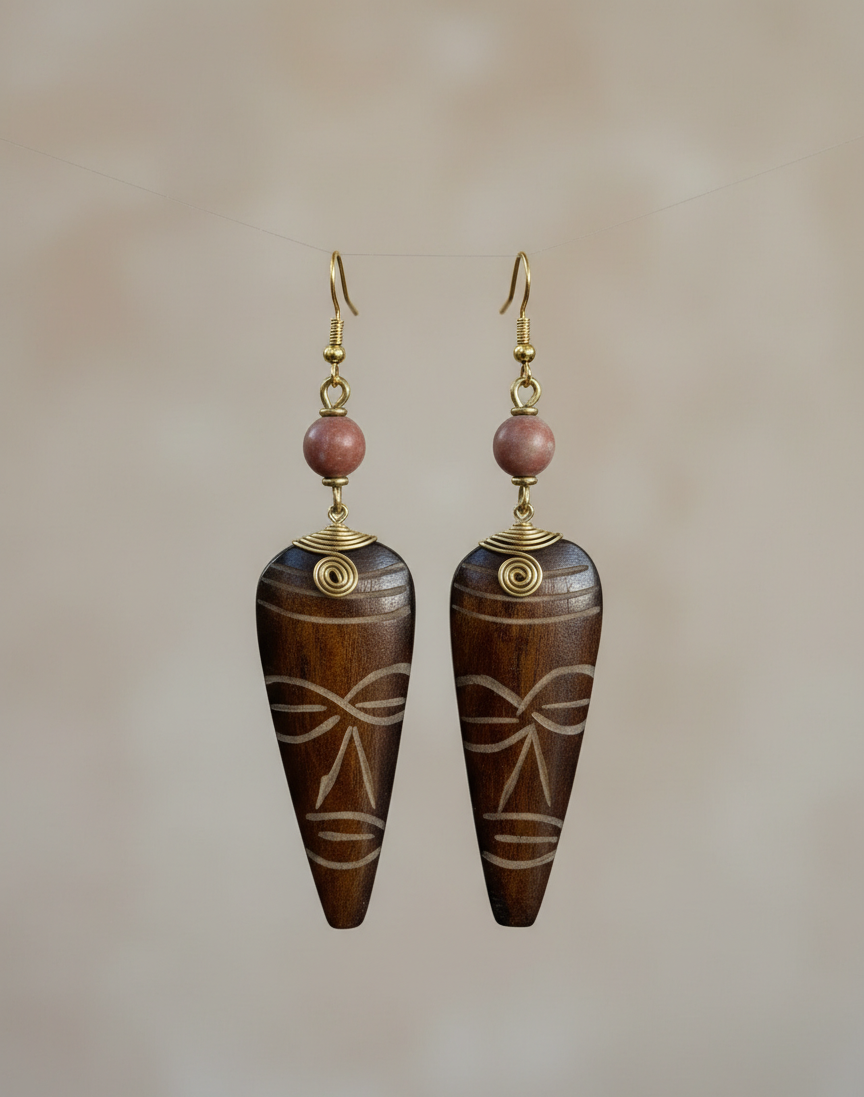 The Ancestral Whisper Earrings honour the quiet strength of those who came before us. Hand-carved horn face pendants, etched with symbolic detailing, are paired with warm earthy beads and delicate brass wire accents — creating a piece that feels both grounded and regal.