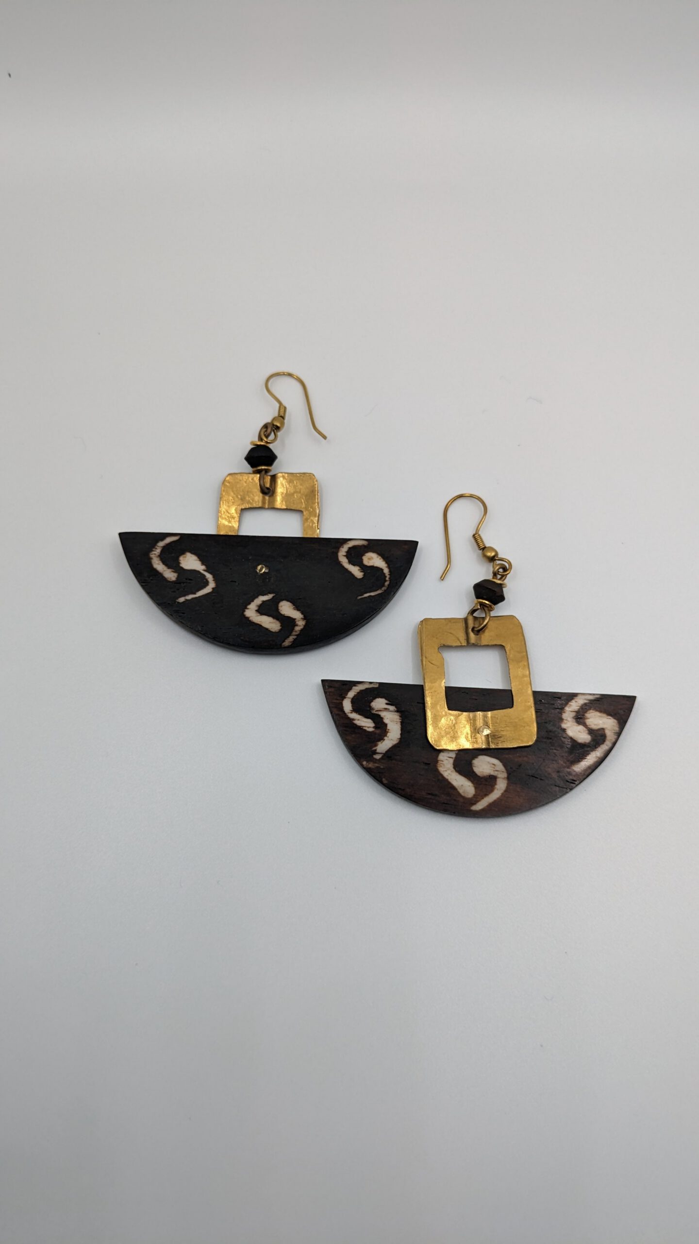 Breathtakingly unique, these handmade earrings boast cow bone half moons paired with hammered brass squares. Adorned with batik-dyed patterns, each bone disc is crowned with a black bead on a hypo-allergenic wire.