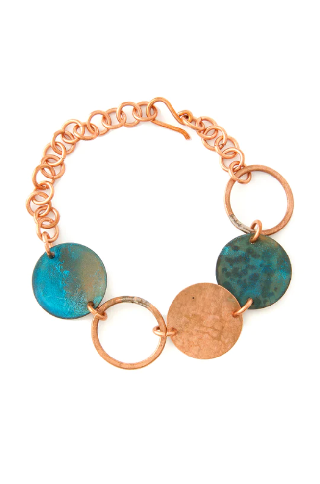 The beautiful Copper Viridian Disc Bracelet is the creation of powerful Zambian women. Despite the nation’s copper export, very little of the resource was used by local artisans—until now. Young and self-taught, these metalworkers are part of F.R.E.E. (Foundation for the Realization of Economic Empowerment), using recycled copper from used water heaters and wire, as well as silver mined locally, to craft modern and eye-catching wearable art.