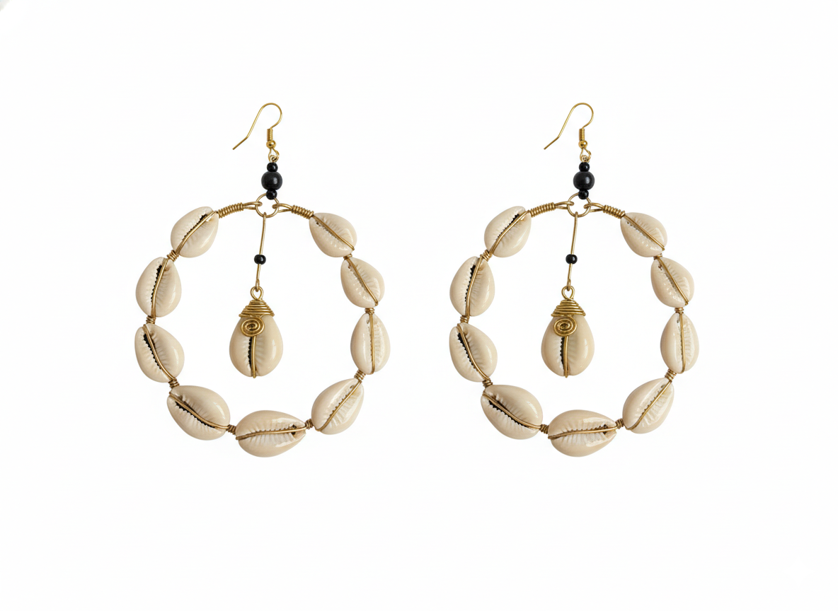 - Artisanal Wirework: Intricate, hand-wrapped brass-finish wire meticulously cradles a fan of premium cowrie shells, creating a “sculpted” look.