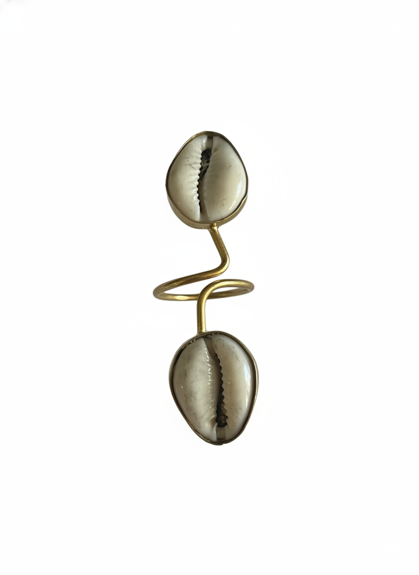 The double Cowrie Statement Ring is lightweight, adjustable and 7 cms long.
