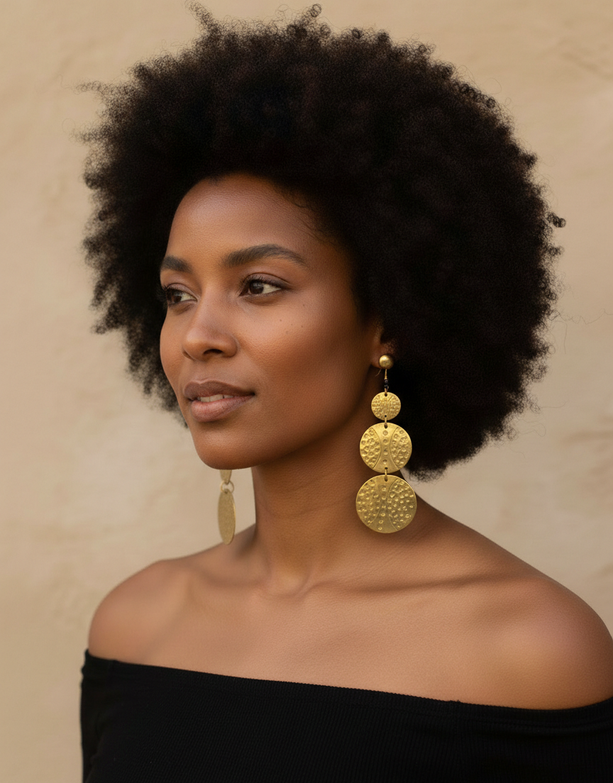 The Mmiɛnsa Brass Drop Earrings feature three hand-textured brass discs suspended in graceful succession — each one catching the light with every turn of your head. The hammered detailing gives depth and dimension, echoing traditional metalwork techniques passed down through generations.